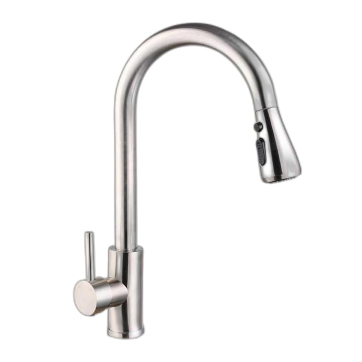 Baterie chiuveta bucatarie, cu dus extractabil, tip U, monocomanda, 2 moduri jet de apa, Opriti apa cu un singur clic, pipa flexibila, otel inoxidabil/cartus ceramic, YWX, Argintiu