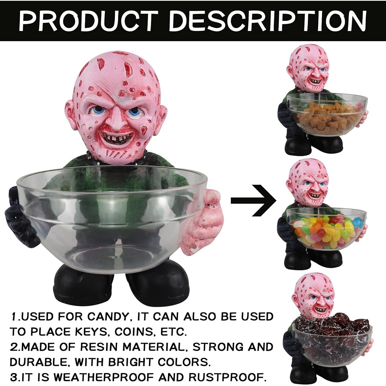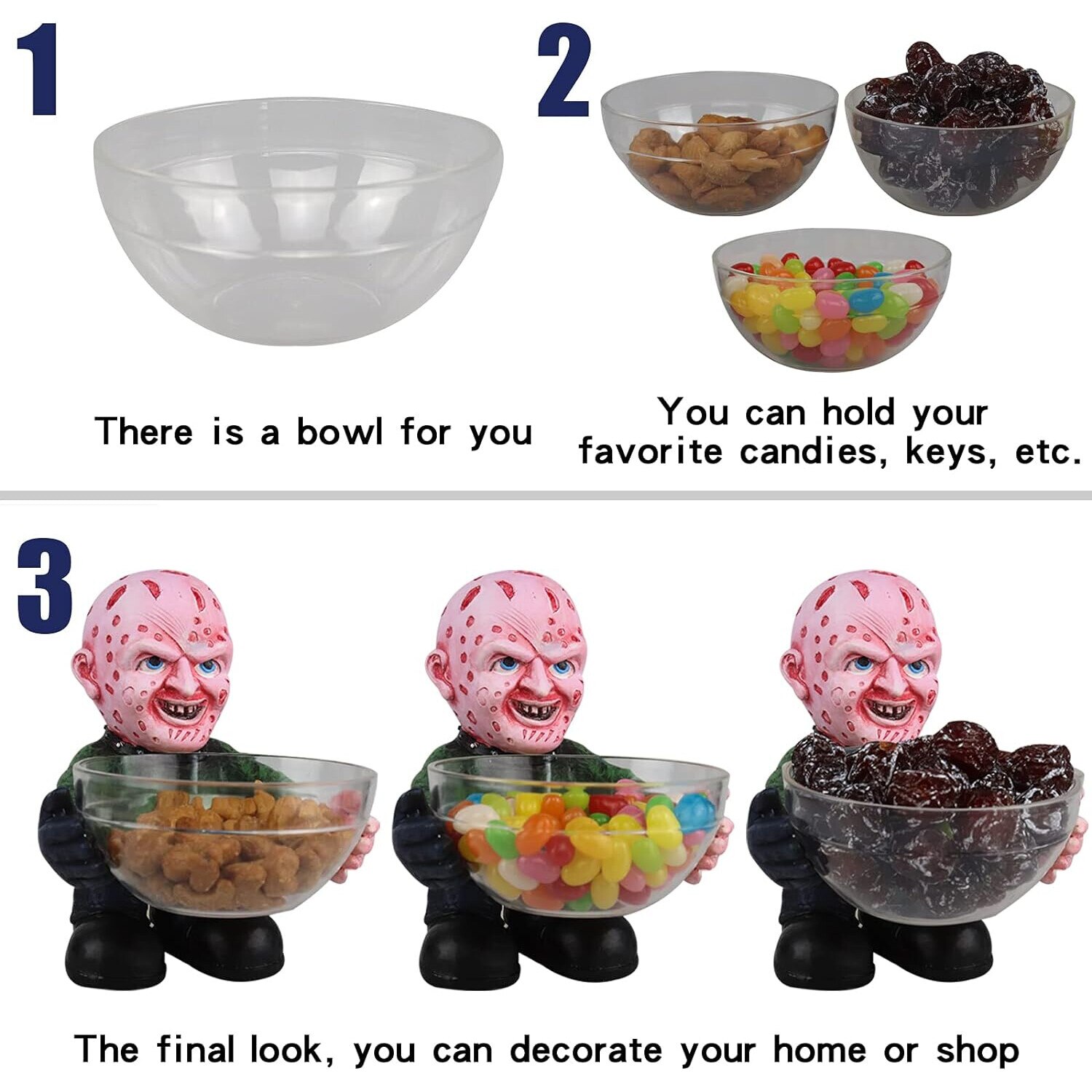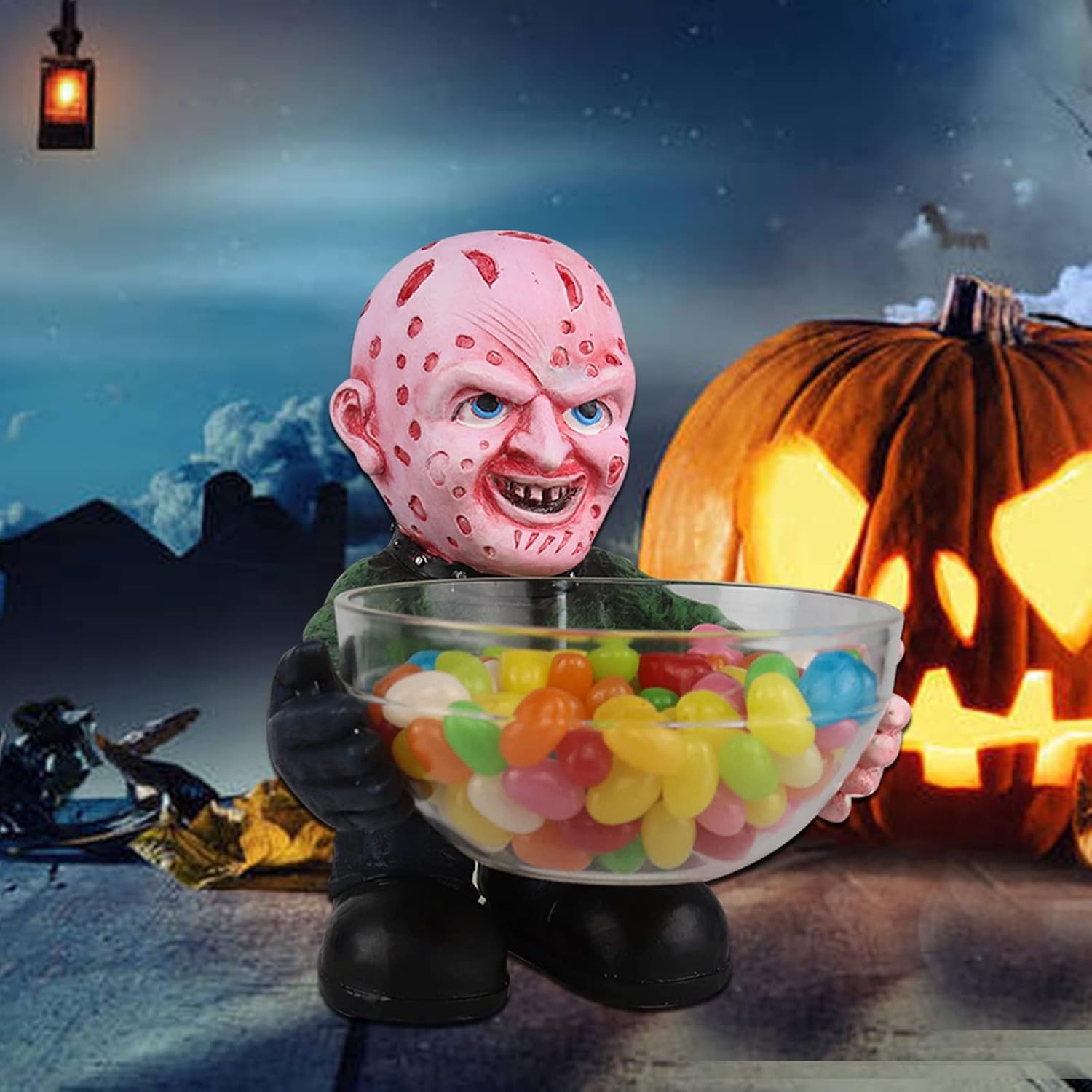 A Nightmare on Elm Street Suport pentru bolul Freddy Kruege, clovn si Jason Voorhees. Truc sau rasfat? Foloseste acest suport pentru bolul de groaza pentru un copil obraznic care vrea zahar. Rezistent la apa, puteti aseza oriunde doriti sa decorati. Dimensiunea este de 12*6*4 cm, greutatea este de aproximativ 300 de grame.^ Freddy este inconfundabil cu capul cicatrici, puloverul rosu si verde si ghearele! Fiecare gnomi de gradina din film de groaza este pictura manuala in detalii, aspectul realist va va inspaimanta prietenii si vecinul.^ O sa va placa felul in care acest suport pentru bolul de bomboane Freddy Krueger din Nightmare on Elm Street arata acasa! Indiferent daca intentionati sa-l folositi pentru a speria copiii din cartier de Halloween sau il folositi in bucatarie pe tot parcursul anului, totul este grozav.^ Livrare rapida catre dvs. Ambalare buna in desene animate umplute cu spuma, nu se va deteriora mai usor in timpul tranzitului. Nu doar pentru bomboane, poate fi folosit pentru a tine carti de vizita, chei, monede, pixuri, favoruri de petrecere si multe altele.
