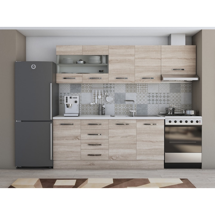 Bucataria ALFA 240 CM, ofera un cadru modern casei dumneavoastra, pretul fiind de producator, aceasta este produsa in Romania iar materialele folosite sunt special create pentru a rezista la conditii extreme, umezeala si zgarieturi.