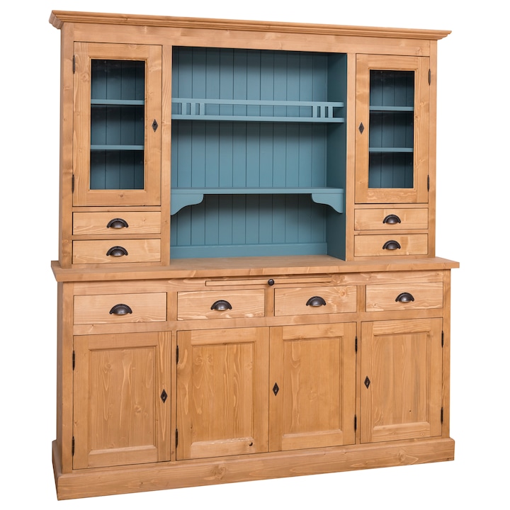 Bufet cu 4 usi, 4 sertare bas, 2 usi sticla, 4 sertare, spatiu deschis sup, culoare exterior natural, culoare interior turcoaz, dublu color, 100% lemn masiv, 180x197x50 cm