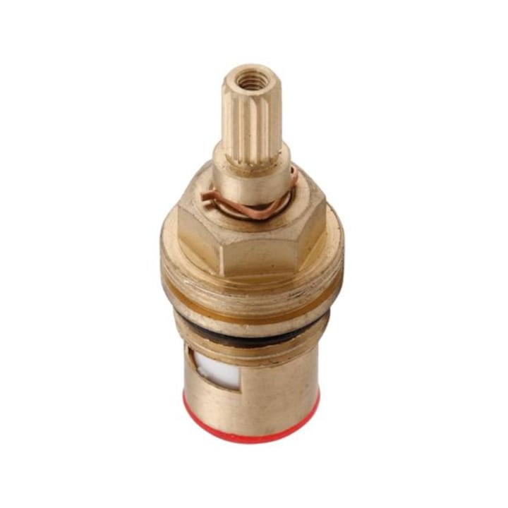 Cartus ceramic pentru baterii Cartus ceramic pentru baterii cu 2 butoane, dimensiune 1/2″, unghi de deschidere 90C. Cartusul se potriveste cu robinete de baie, lavoar si bucatarie in stil retro (alama antica, crom). Parametri: Latime: 30 mm Inaltime: 58 mm Adancime: 30 mm Diametru filet: 1/2″ Material: alama Finisaj: alama