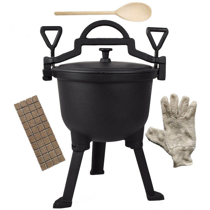 Cazan din fonta 4L Cazan de vanatoare din fonta de inalta calitate in Polonia, finisat cu atentie si ars la temperatura ridicata, care ii afecteaza rezistenta si factorii climatici. Fonta se incalzeste rapid, asigurand o distributie uniforma a temperaturii, datorita careia veti pregati rapid feluri de mancare gustoase si fierbinti, care vor fi atat moi cat si crocante. Pentru a proteja interiorul cazanului, ungeti-l cu ulei, care formeaza un strat protector dupa prima epuizare. Cazanele nu sunt vopsite suplimentar in interior. Dimensiuni: 29 cm x 29 cm x 42 cm Diametru interior: 21 cm Adancime interioara: 17 cm Inaltimea cazanului in sine: 30 cm Greutate: 9 kg Capacitate: 4 litri Inainte de utilizare, va recomandam sa captusiti interiorul cazanului cu aluminiu alimentar folie. Bricheta universala si ecologica in cuburi, o manusa de protectie si o lingura de lemn de 30 cm gratuit cu fiecare ceaun! Bricheta se caracterizeaza printr-o calitate ridicata si o ardere indelungata si, datorita faptului ca este fabricata din materiale ecologice, nu afecteaza negativ gustul si nu emite substante nocive. Produsul este fabricat in Polonia. Produsul este turnat intr-o turnatorie poloneza. In calitate de producator de piese turnate pe care le oferim, garantam o calitate ridicata si o durabilitate indelungata datorita utilizarii metodelor moderne de fabricare a elementelor din fonta si a fontei de inalta calitate cu un perete gros de turnare.