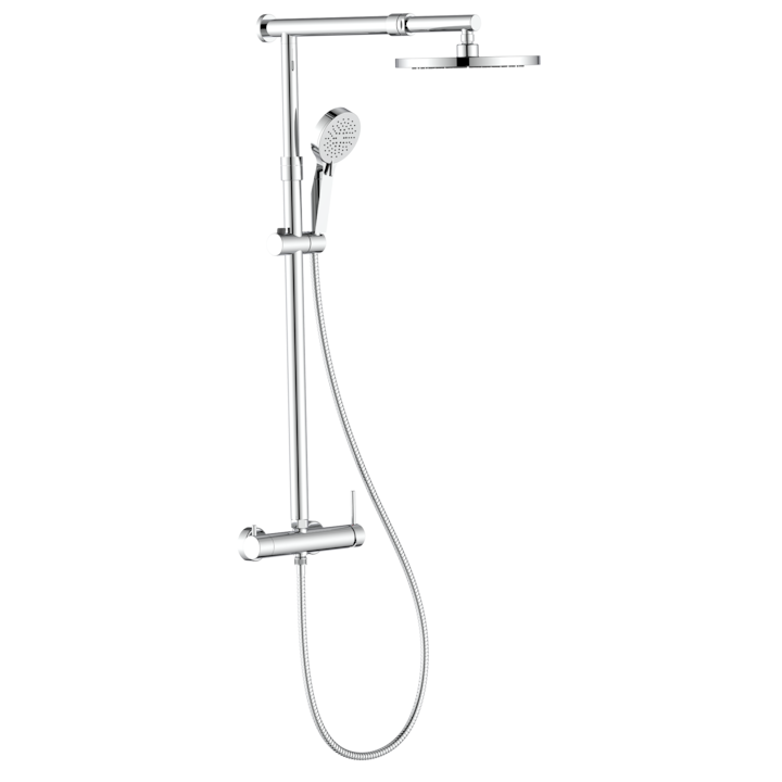 SIstem/Coloana de dus MOREA din otel inoxidabil, finisaj integral Crom Lucios. Para fixa de dus (palarie dus) din ABS cu diametrul Ø 25 cm si 1 functie, protectie  anticalcar. Para mobila de dus din ABS cu diametrul  Ø 10 cm si 3 functii si protectie  anticalcar, cu garnitura pentru economia de apa. Bratul parei fixei de dus este extensibil in adancime intre 37 – 55 cm. Bara de dus cu lungimea reglabila in faza de montaj intre 78,5 – 135 cm, diametrul Ø 32 mm, cu glisor mobil din ABS cu actionare prin apasare pe buton. Furtun de dus 1500 mm din metal, cu dubla agrafare. Include baterie de dus din metal (alama), cu cartus cu discuri ceramice. Deviator ceramic din metal (alama).