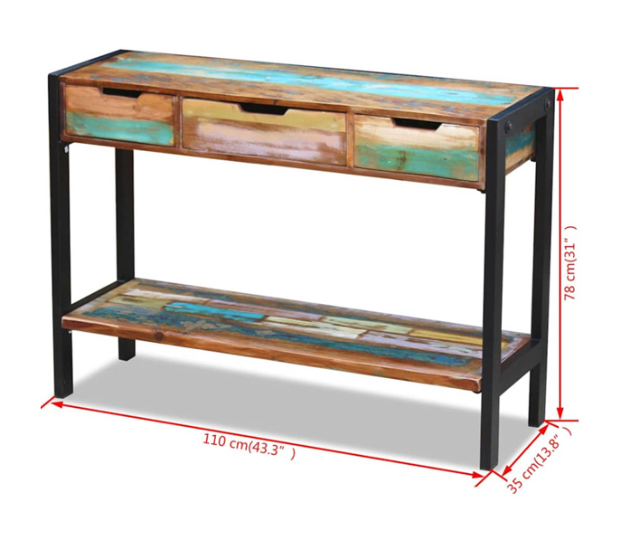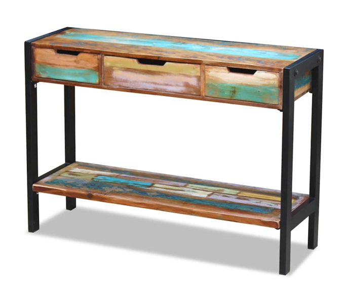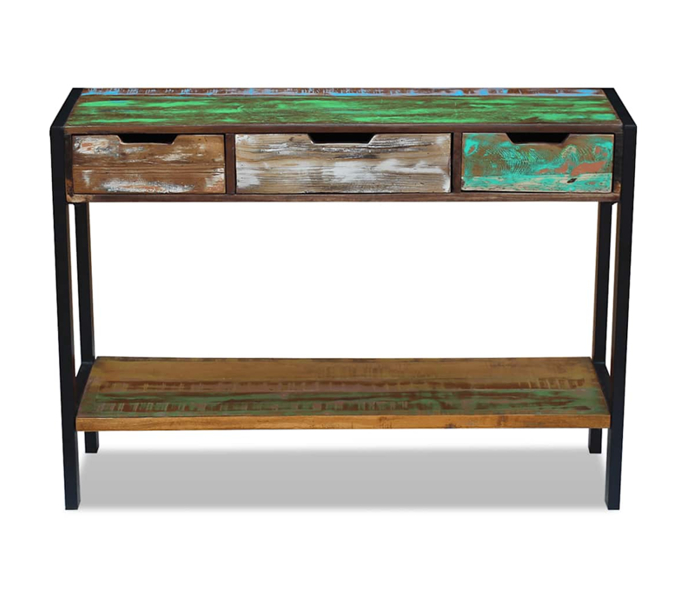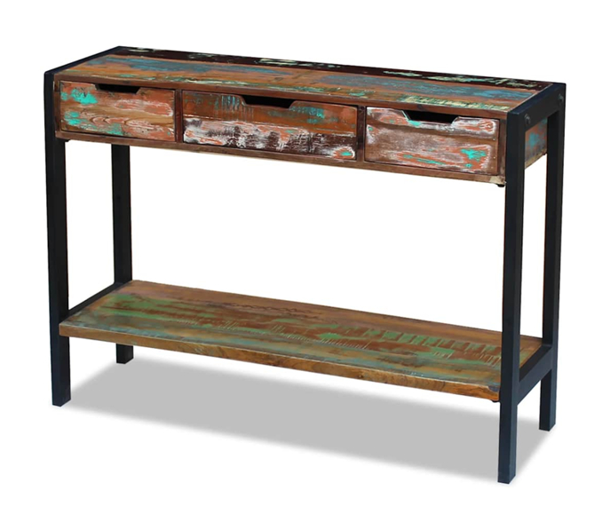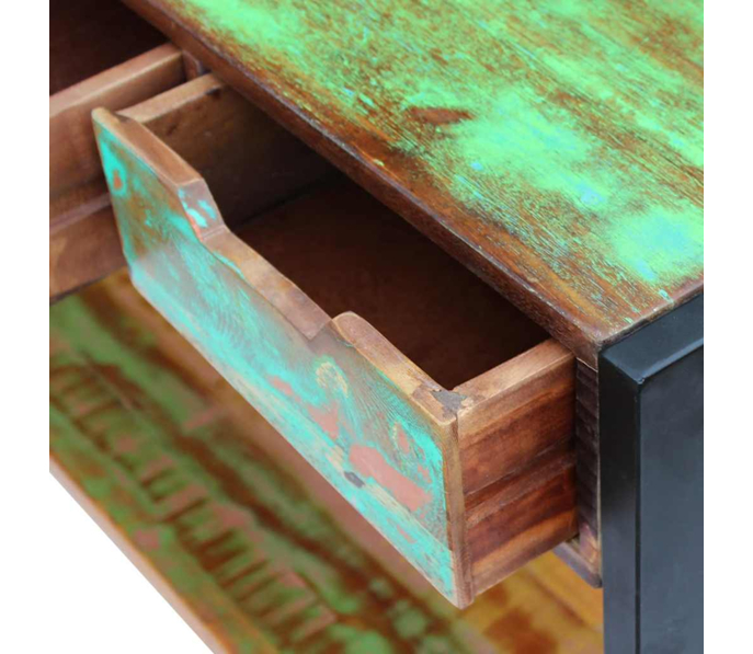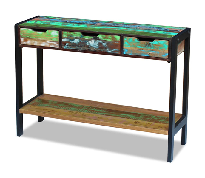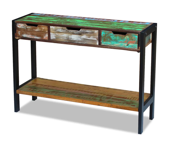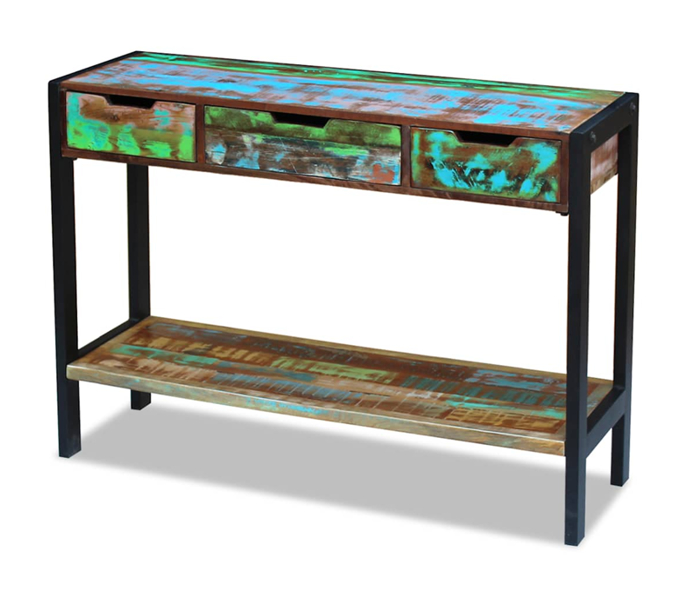 Aceasta servanta din lemn, in stil vintage, realizata din lemn masiv reciclat, va aduce o completare mereu la moda casei dvs. Datorita cadrului solid din otel, masa laterala este foarte stabila si durabila. Blatul ofera o suprafata stabila si sigura pe care puteti plasa bauturi, un cos cu fructe, o vaza sau alte obiecte decorative. Are trei sertare care ofera spatiu suficient pentru depozitarea obiectelor mici, precum chei, carnete de notite si alte maruntisuri. Raftul din partea de jos ofera spatiu suplimentar pentru pastrarea lucrurilor in mod organizat. De asemenea, servanta poate fi utilizata ca masa consola, dulap lateral etc. Aceasta servanta este realizata din lemn reciclat, ceea ce inseamna ca fiecare piesa de mobilier este unica si usor diferita fata de cealalta. Mobila realizata din lemn reciclat are caracteristicile diferitelor tipuri de lemn, precum lemnul de tec, acacia, mango, saal etc. Lemnul reciclat este solid, stabil, durabil, si frumos. Semnele de uzura si structura texturata vizibila ofera fiecarei piese de mobilier propria sa istorie si un aspect unic. Masa laterala este realizata complet manual, ceea ce a contribuit la aspectul spectaculos, in stil retro. Fiecare pas al procesului este realizat cu cea mai mare grija, fie ca este vorba de recombinare, lustruire, vopsire sau ceruire. Nota importanta: Culorile variaza de la piesa la piesa, fiecare dintre servantele noastre fiind unica; livrarea este aleatorie.