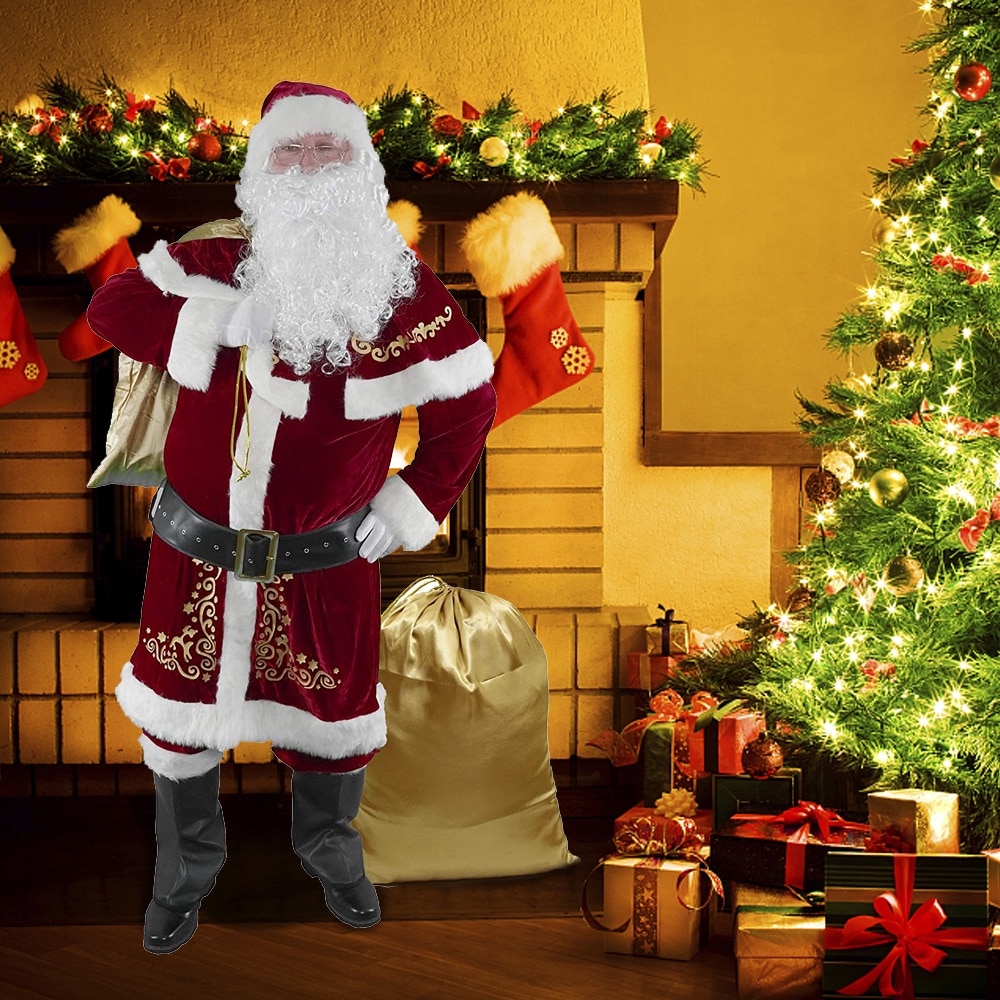 Costum Mos Craciun Complet 13 piese, XL Include Pantaloni, Haina, Caciula, Barba, Peruca, Manusi, Ochelari, Curea, Sac Cadouri si Clopotel. Ideal pentru petreceri tematice, evenimente, animatori si fotografi. Calitate superioara, confortabil si durabil
