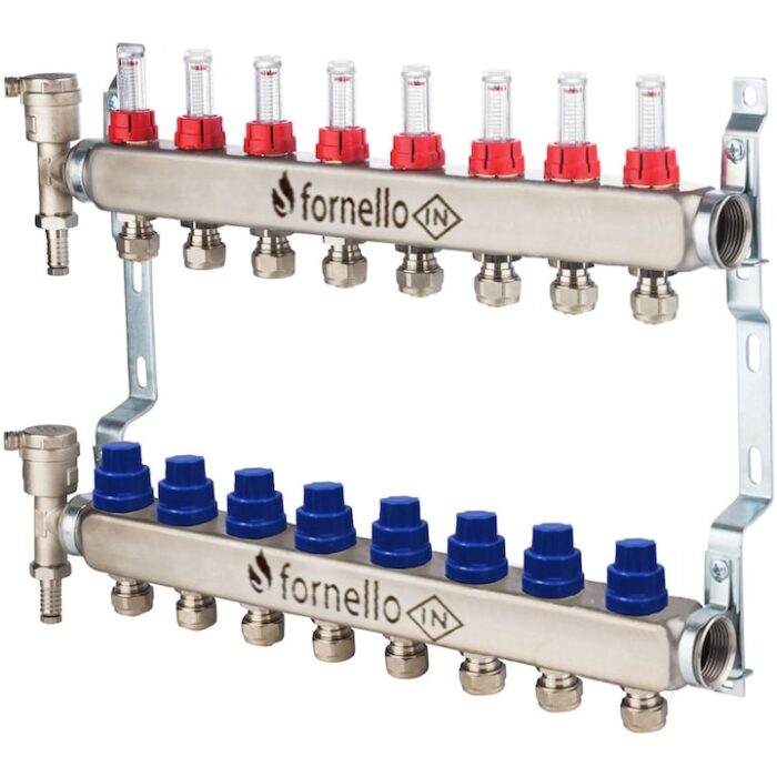 Distribuitor-Colector Fornello, echipat cu debitmetre, robineti si aerisitoare, inox, filet interior, 8 cai, 1″