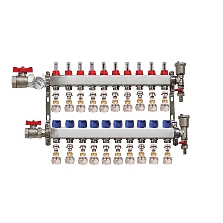 – Distribuitor rectangular 1″ din inox cu debitmetre 0 … 5 l/min pe tur si ventile M30x1,5 pentru oprirea sau reglarea debitului pe retur ( pot fi controlate manual sau automat cu actuatoare electrotermice);