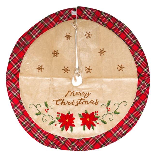 Fusta decorativa pentru brad, bej catifelata cu craciunita brodata si Merry Christmas, cu carouri rosii. Diametru 90cm si inchidere cu sireturi. Completeaza impodobirea bradului de craciun!
