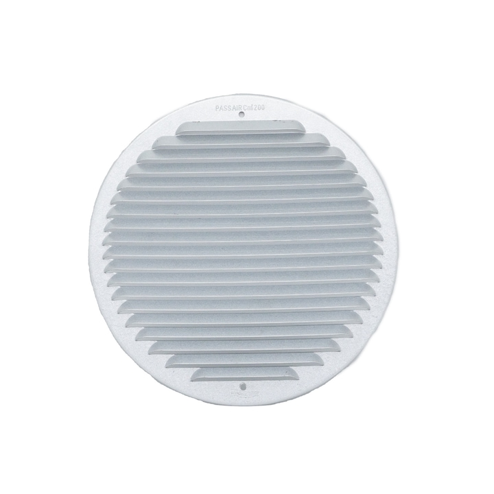 Grila de ventilatie rotunda suprapozabila. Se prinde in perete cu gauri si dibluri. Este din aluzink (acoperita pe ambele fete cu aliaj de aluminiu si zinc, intr-un proces de galvanizare la cald similar cu procedeul de zincare la cald). Materialul permite obtinerea unei rezistente de 4 ori mai mare la coroziunea atmosferica