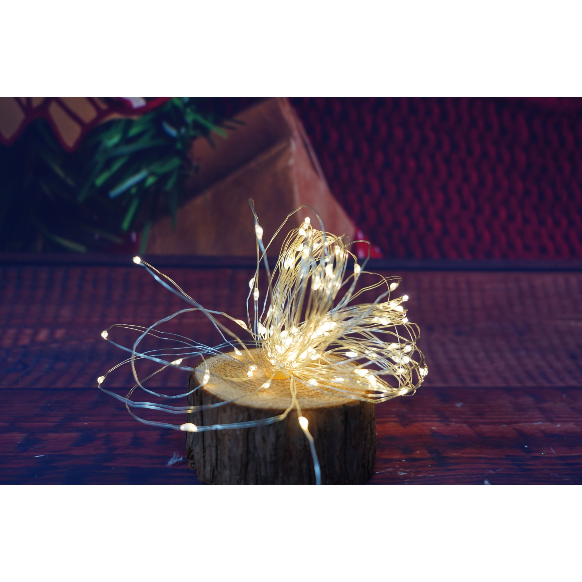 Instalatia luminoasa este de tip sir, liniara, cu 100 LED-uri de culoare alb cald, avand o lungime de 10 m, cu fir transparent realizat dintr-un plastic anti-inghet, iar firele electrice sunt fabricate din cupru.