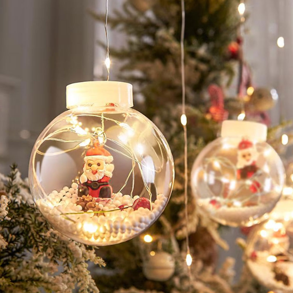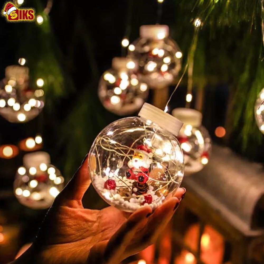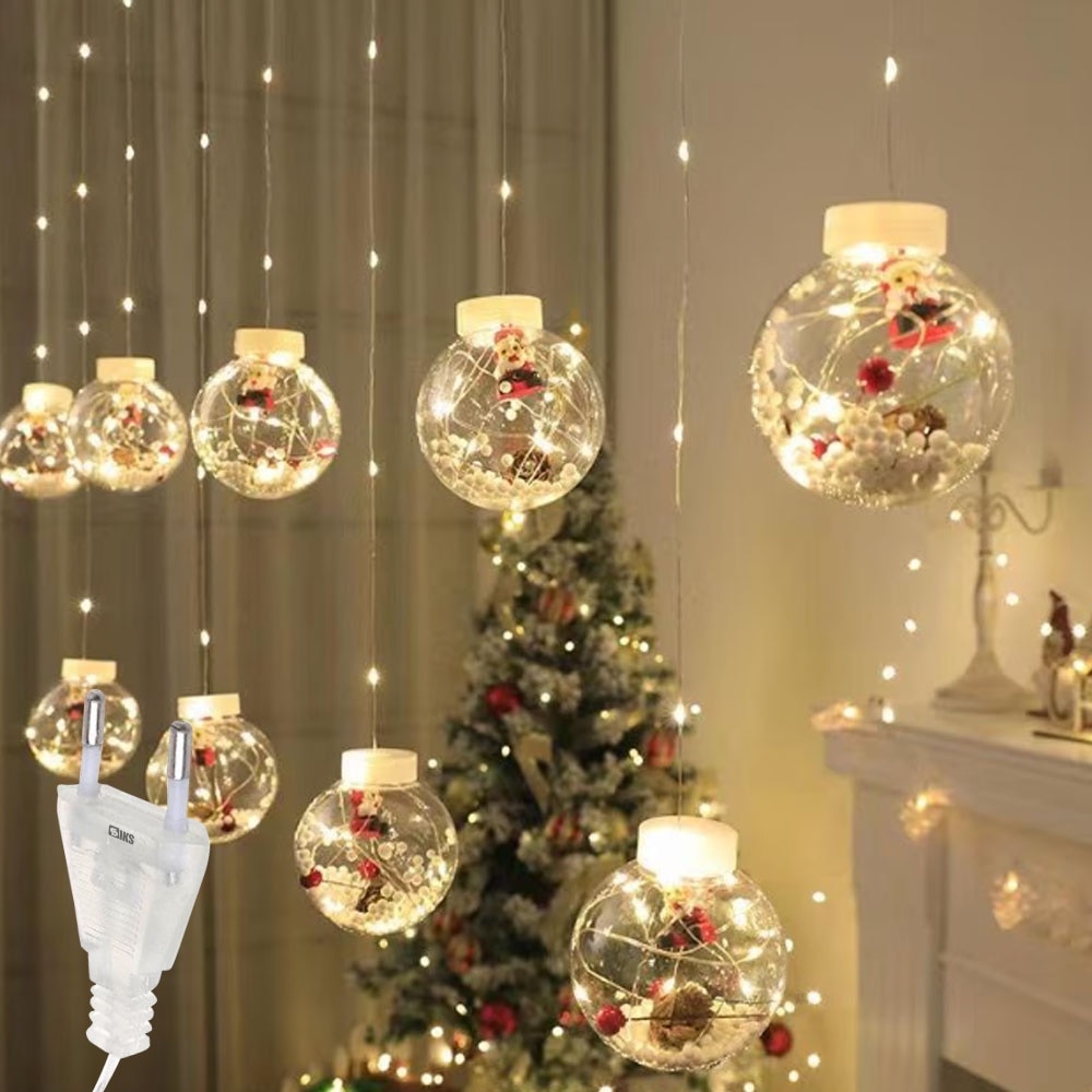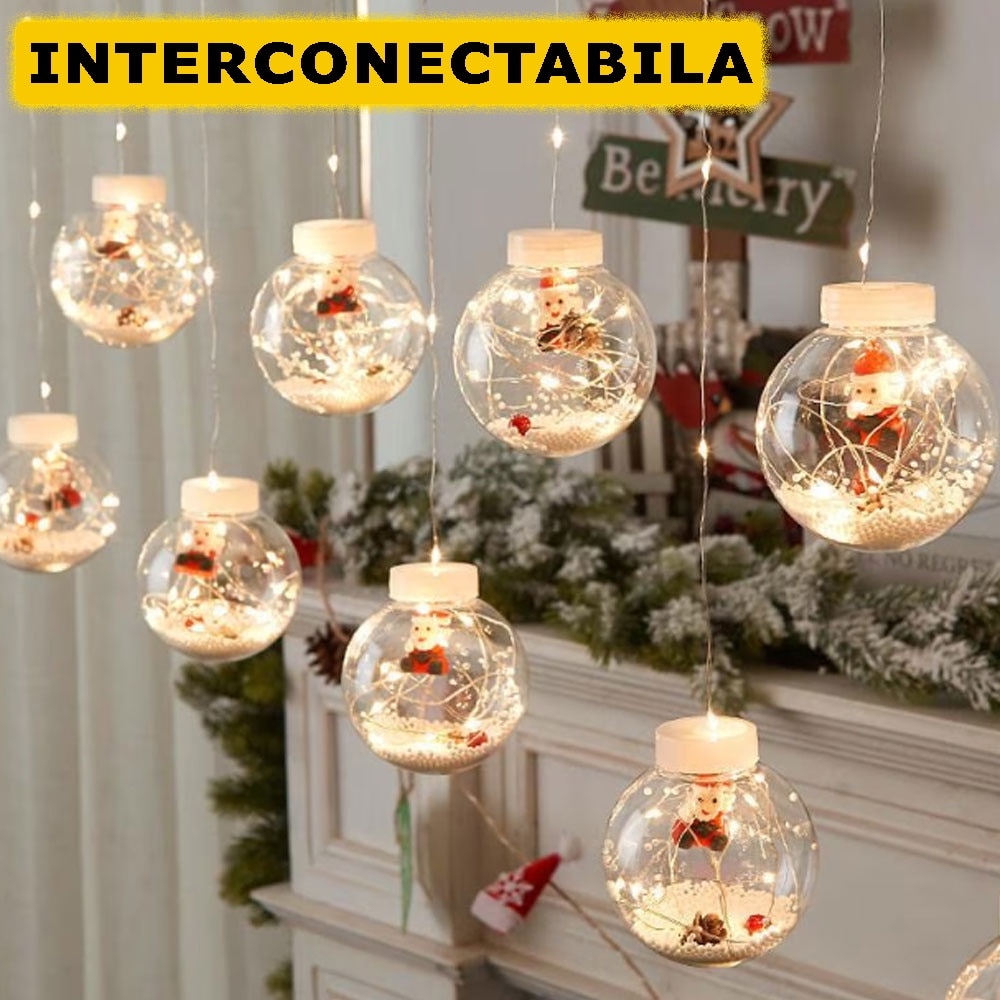 1 x Instalatie Craciun Perdea Luminoasa SIKS Tip Glob Cu Conuri Brad,10 Figurine Mos Craciun, Interconectabila, 8 Jocuri De Lumini, Alb Cald, 3m, 24V.