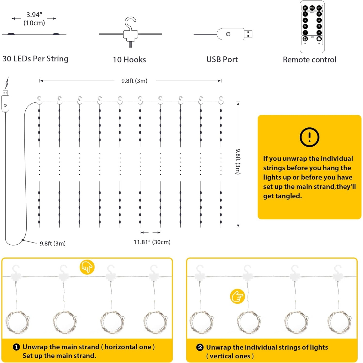 Instalatie de Craciun Perdea, Xinxu, cu Telecomanda, 300 led, 3 M x 3 M, 8 Moduri, Rezistenta la apa, cu carlig, Luminozitate reglabila, Alb cald