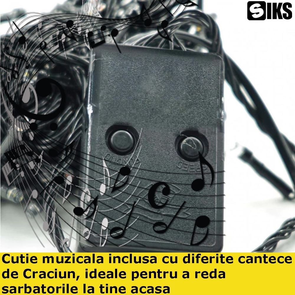 Home Decoratiuni, ornamente si articole Craciun Instalatii de Craciun Instalatie SIKS de Craciun Muzicala, Fir Verde, Tip Sir, 100 LED, 10m, Interior Si Exterior, Interconectabila, Alimentare Priza, Cutiuta Muzicala, Multicolor