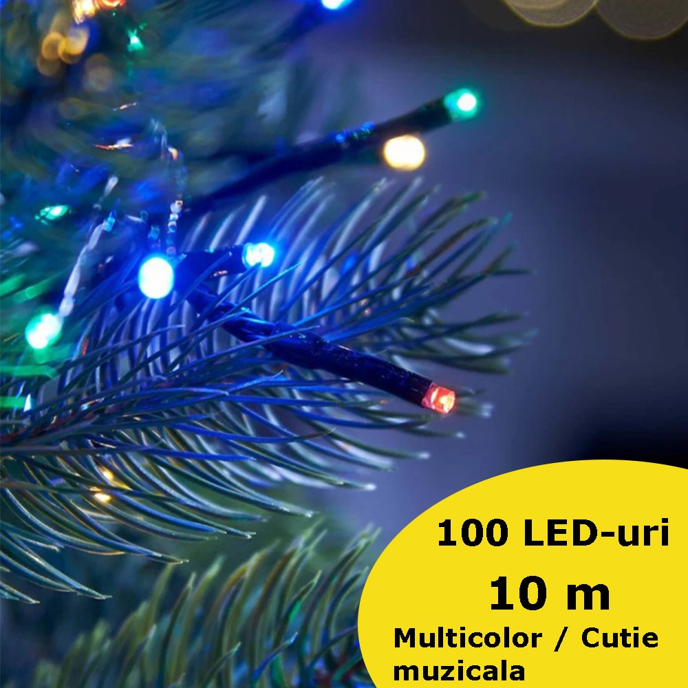 Instalatie de craciun muzicala, fir verde, tip sir, 100 led, lungime 10m, interior/exterior, interconectabila, alimentare la priza, multicolor