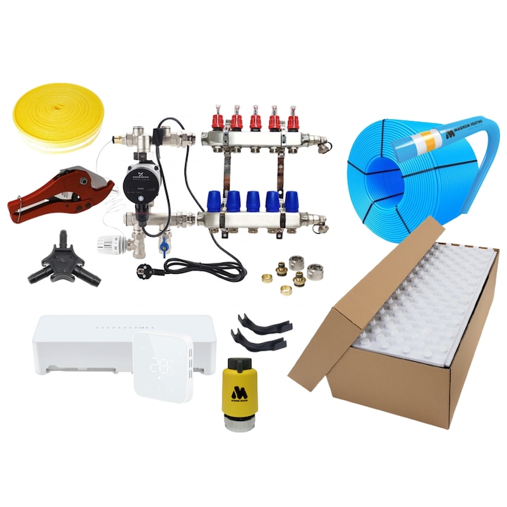 Kit incalzire in pardoseala cu agent termic, sistem clasic cu placa cu nuturi Magnum Heating, 60m² + Grup de mixare si automatizare WIFI