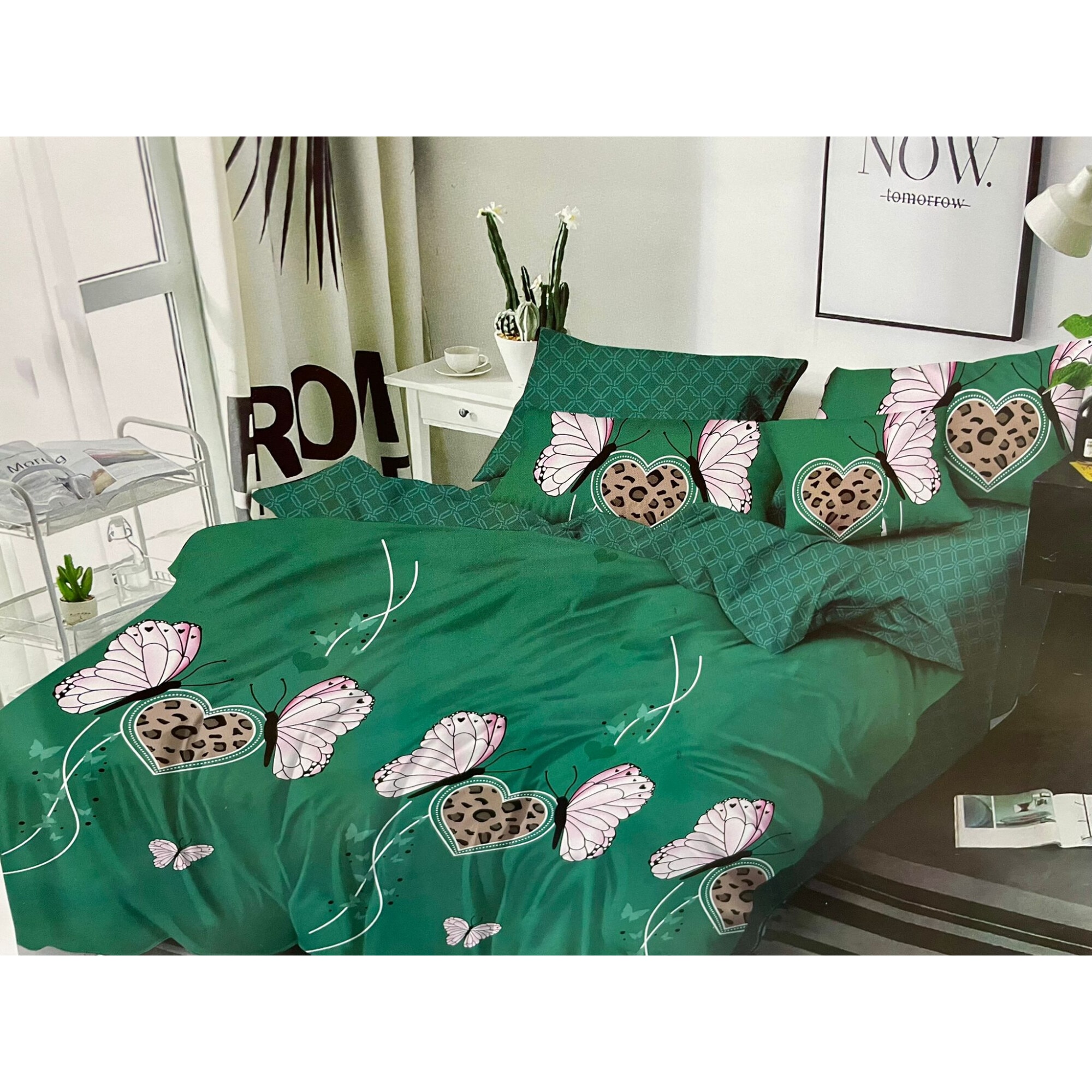 Lenjerie de Pat Finet 6 Piese, Verde cu Fluturi, Super Elegant Pucioasa