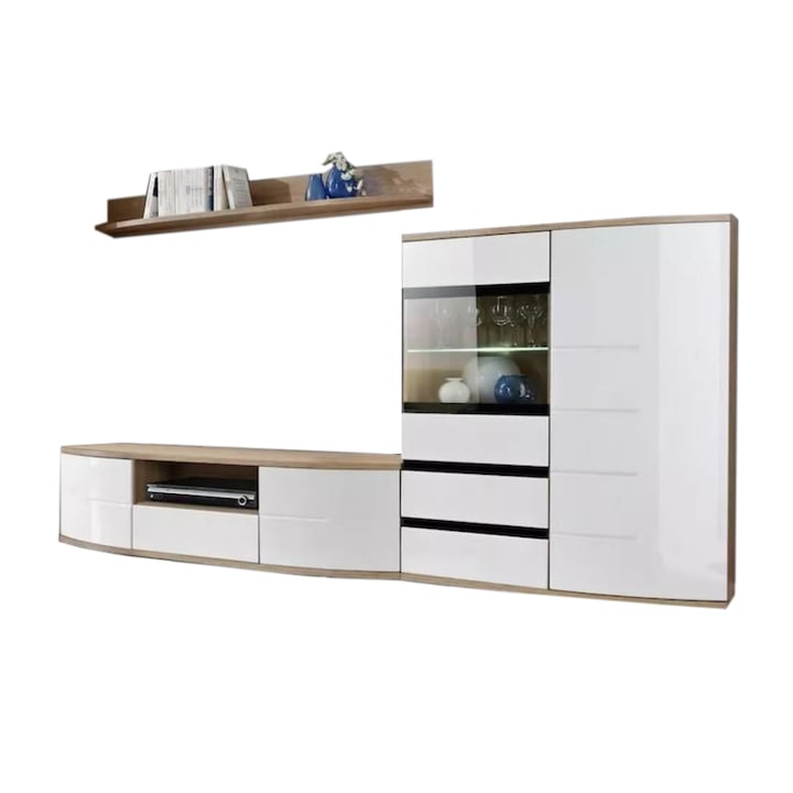 Living ONTARIO lll – o solutie perfecta pentru cei care apreciaza simplitatea, functionalitatea si eleganta. Modulele indeplinesc toate functiile necesare in camera de zi: vitrina pentru elementele decorative, polita suspendata, comoda RTV. Vitrina iluminata cu LED-uri eficiente energetic emana o lumina moale, care pune accentul subtil pe decoratiunile stabilite pe ele.