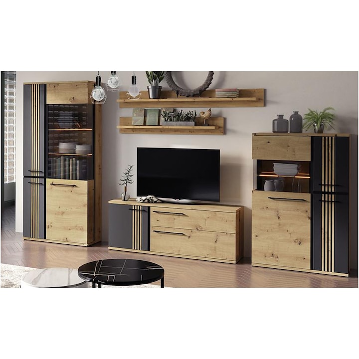 Daca cautati un mobilier living care sa aduca un plus de stil si functionalitate spatiului vostru, mobilierul nostru combinat din lemn natural si negru riflaj cu vitrina este alegerea perfecta. Comandati acum si transformati-va livingul intr-un spatiu plin de rafinament si confort.