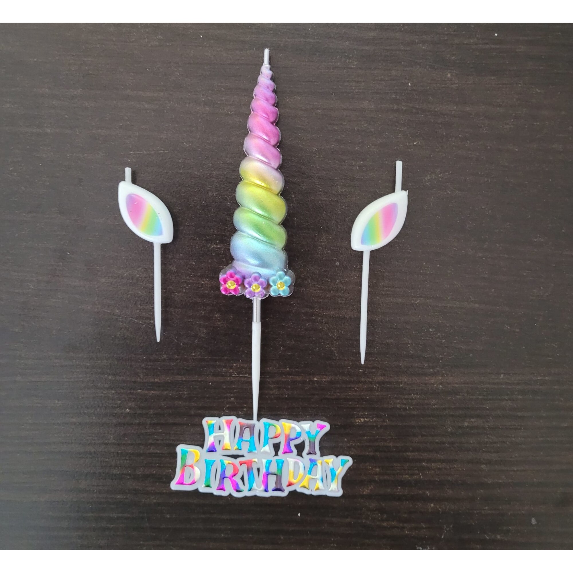 Setul contine 3 lumanari:una in forma de corn de unicorn si 2 in forma de urechiuse. Lumanarile sunt imprimate multicolor.
