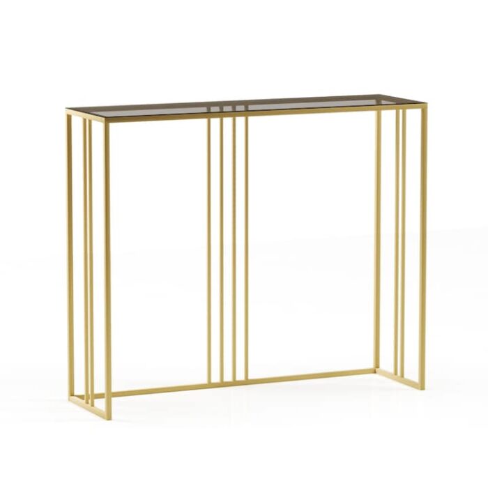 - Masa tip consola din metal vopsit auriu cu sticla securizata fumurie.