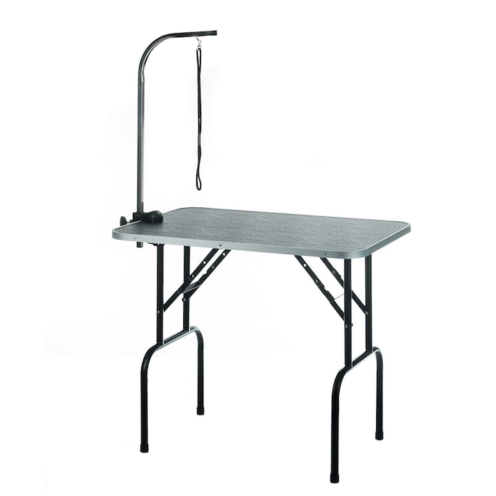 Masa de toaletat pentru ingrijirea animalelor, marimea L. Blat extrem de stabil acoperit cu un covor negru anti-alunecare. Cadru din aluminiu negru. Masa este foarte usor de asamblat, asa ca poate fi folosita pentru lucrul mobil cu animalele de companie. Setul include un brat reglabil pe inaltime cu snur.