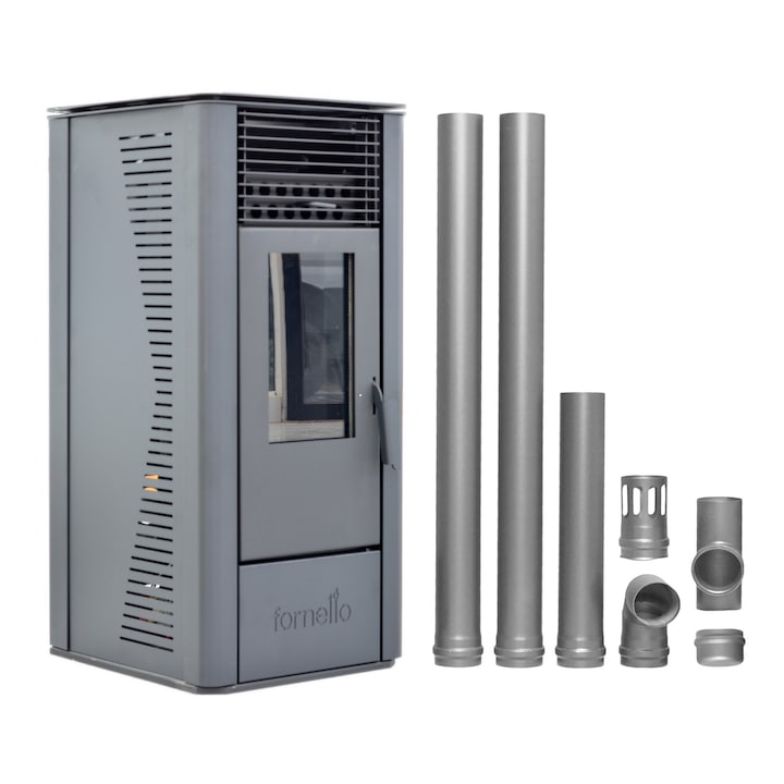 Pachet Semineu soba pe peleti cu aer cald, Fornello Sophia Premium 11 kw, aprindere electrica, tiraj fortat, telecomanda, culoare Black, recomandat pentru 110 mp, focar din fonta, capacitate buncar 22 kg, consum 0.8 kh/h, Kit evacuare 2.5 ml.