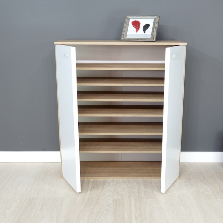 Home Mobila Hol Dulapuri pantofi Pantofar 2U6P, Stejar Urban/Alb, H115xL60xA34 cm, cu 2 usi si 6 polite, PAL 18mm