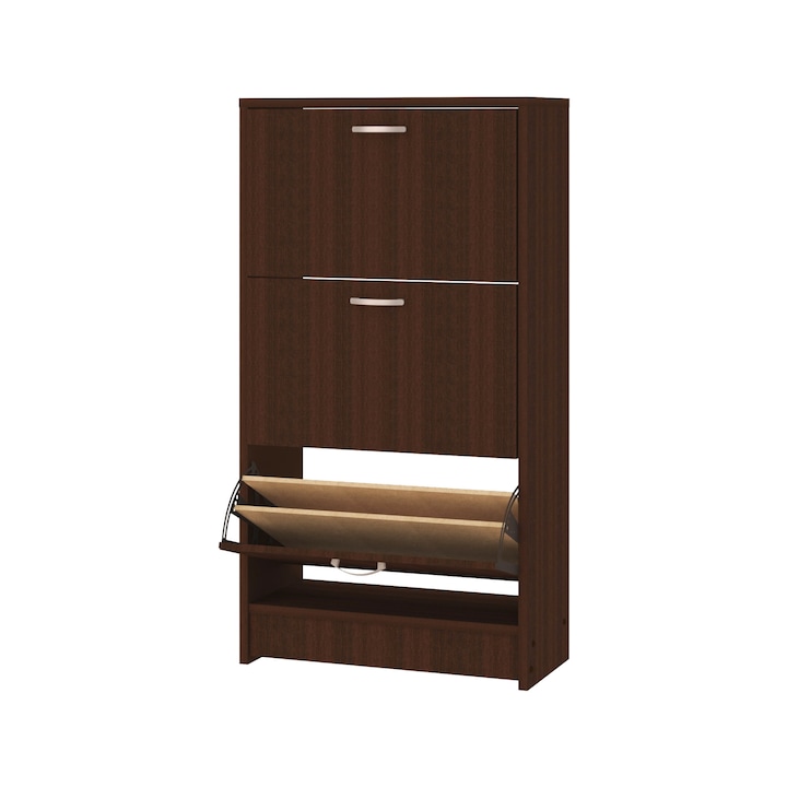 Pantofarul cu trei usi ofera un cadru modern casei dumneavoastra datorita designului cromatic bine ales. In plus, pretul este unul accesibil si materialele folosite sunt special create pentru a rezista la umezeala si conditii extreme. Acesta este realizat din Pal melaminat de 16mm, decor Wenge. In plus, este ideal atat pentru spatiile restranse cat si pentru cele mai voluminoase, datorita dimensiunilor atent alese. De mentionat faptul ca, fiecare usa dispune de doua spatii de depozitare.