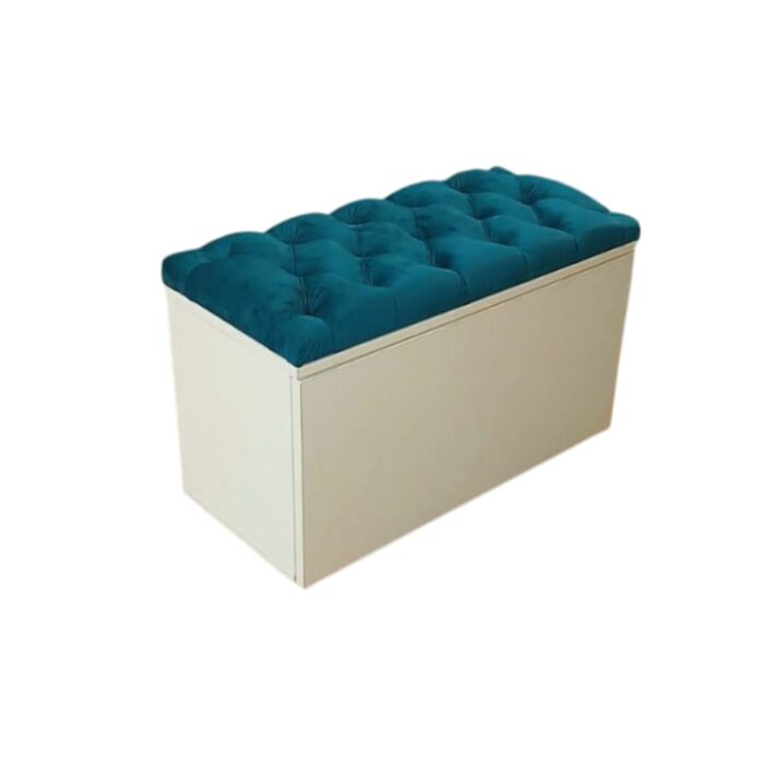 Pantofar tip bancuta din pal alb si tapiterie turcoaz din catifea.Tapiteria este foarte moale si placuta la atingere. Pantofarul are o usa rabatabila. Deschidere tip push-on
