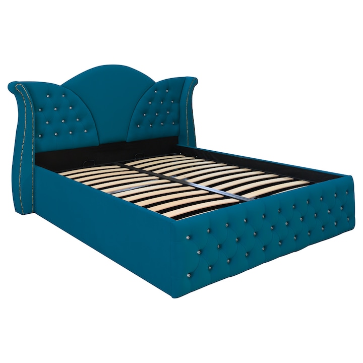 Structura patului este formata din lemn si pal melaminat. Aceasta este acoperita cu spuma poliuretanica in grosime de 50 mm si vatelina, urmata de stratul final reprezentat de o catifea fina si, totodata, usor de intretinut. Tablia patului este tapitata in stilul Chesterfield, cu nasturi de sticla. Somiera este fixata pe lateralele dublate ale patului in grosime de 40 mm, dobandind astfel o rezistenta crescuta in timp.