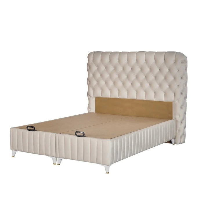 Pat dublu tapitat Georgia, 160/200 cm, crem cu benzi aurii, cu somiera metalica rabatabila si spatiu de depozitare