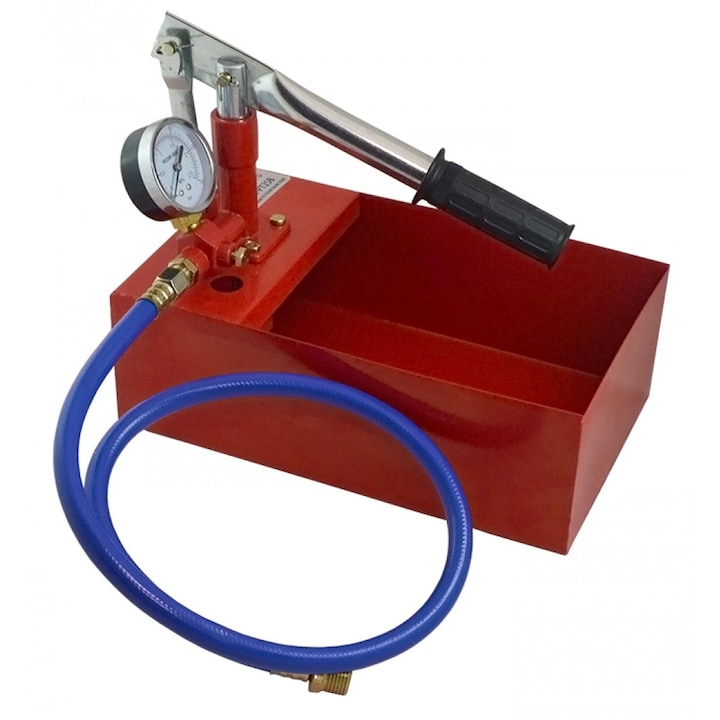 Pompa manuala de testat instalatii 25 bar Basic Everpro (neasamblata) Domenii de utilzare Pompa manuala de testare se utilizeaza in toate tipurile de instalatii, cum ar fi: instaltiile sanitare, de incalzire, cu aburi, de aer comprimat si sisteme de racire, conducte lungi cu diametre mici etc. Utilizatorul poate presuriza cu usurinta sistemul, cu ajutorul supapelor de presiune, a pistonului, si a parghieie de actionare. Avantaje cu efort minim de utilizare se poate verifica rapid etanseitatea unei instaltii sau a unui sistem de tevi presiunea se mentine automat si nu sunt necesare ventile cu actionare manuala sistemul se umple si se presutizeaza rapid, prin efectul de parghie recipientul din metal este prevazut cu o pompa cu piston si racord de 1/2 inch umplerea si testarea instalatiei dintr-o singura miscare pompa este ideala pentru lucrul in spatii inguste Date tehnice Capacitate de pompare: 8 ml /cursa Presiune: 0-25 bar Volumul cuvei: 5 litrii Dimensiuni: 30x18x25 cm Se livreaza dezasamblata.
