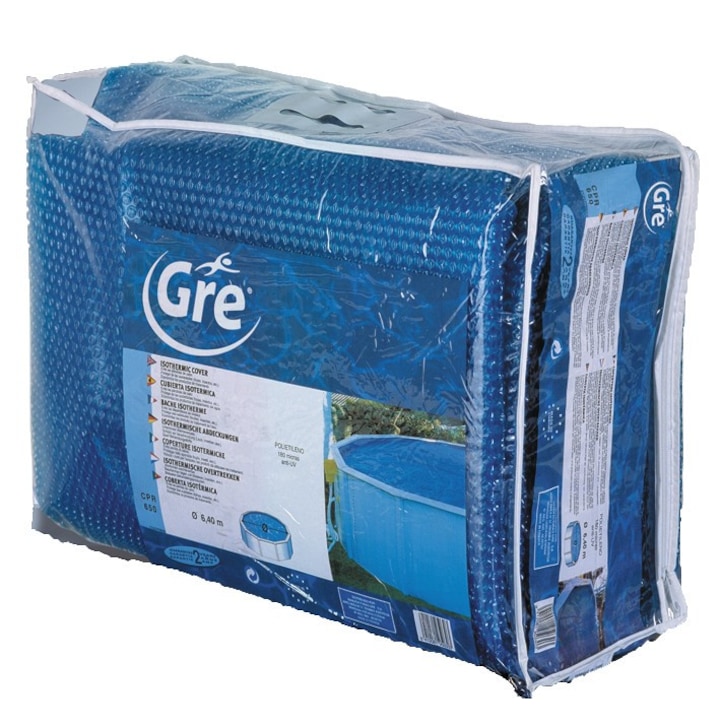 Prelata izoterma de vara Gre care pluteste pe apa, pentru piscine ovale cu dimensiuneile 610×375 cm. Ajuta la protejearea apei de praf, frunze si insecte si ajuta la mentinerea temperaturii apei cat mai independenta de cea exterioara.