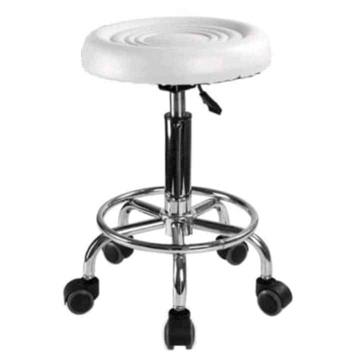 Scaun hidraulic pe roti, Alb, Taburet rotativ, Pentru salon, Cosmetica, Pedichiura, Manichiura, Frizerie, Coafor, Piele ecologica, Cu suport pentru picioare