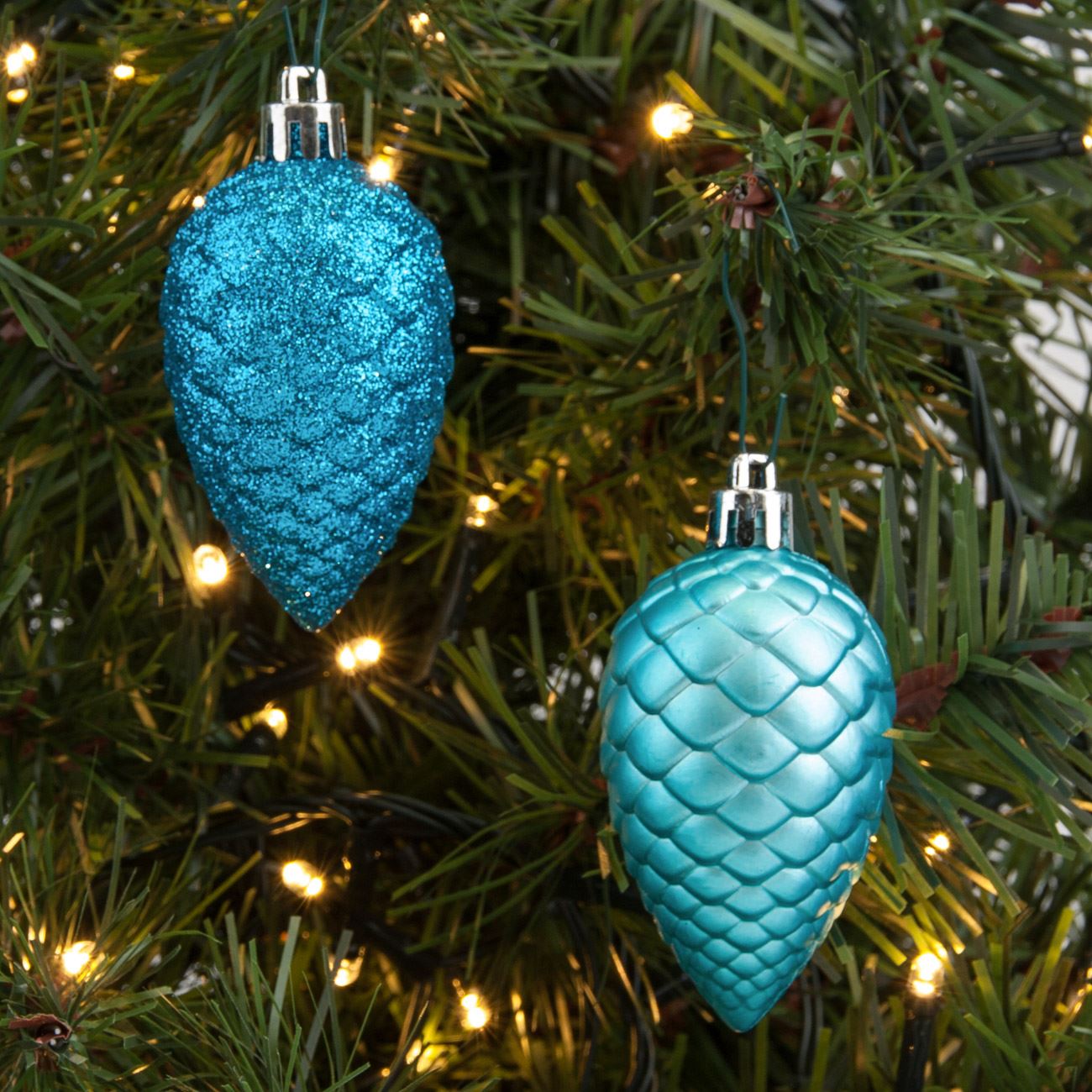 Set 12 globuri albastre turcoaz in forma de con brad de Craciun, DecorCasa, 8 cm