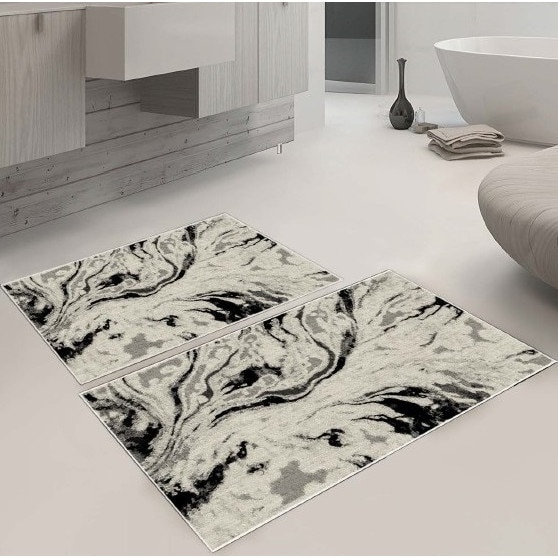Set 2 covoare baie, negru/alb, dimensiune, Covor mare 60 x 90 cm, covor mic 40 x 60 cm