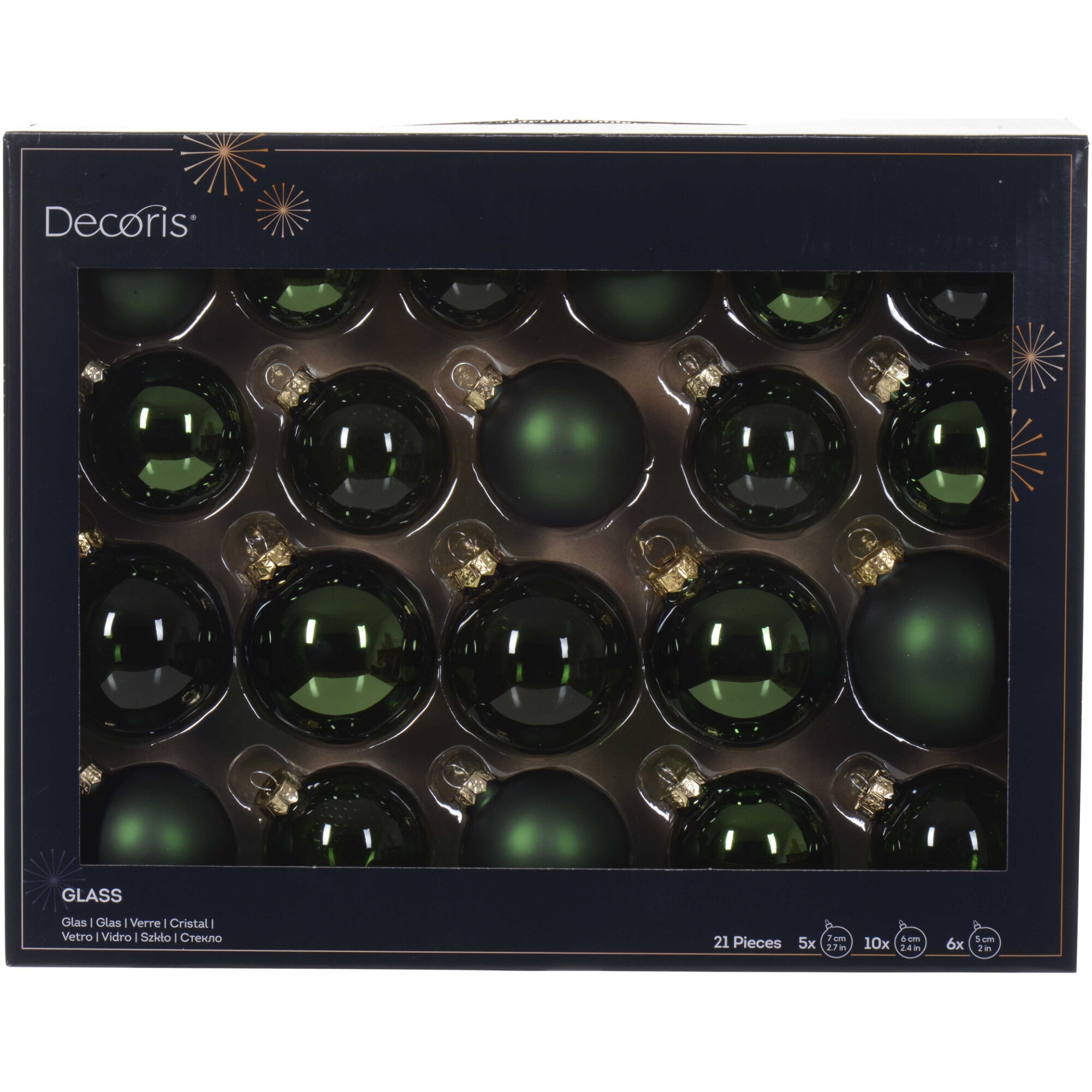 Home Decoratiuni, ornamente si articole Craciun Globuri de Craciun Set 21 globuri asortate Decoris, diametre 5-7 cm, sticla, finisaje diverse, verde inchis