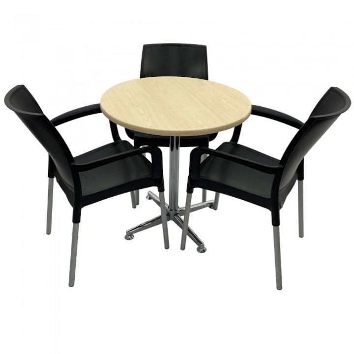 Set 3 scaune SUNSET negre si masa rotunda D70cm RAKI MAPLE cu blat werzalit si picior cromat.