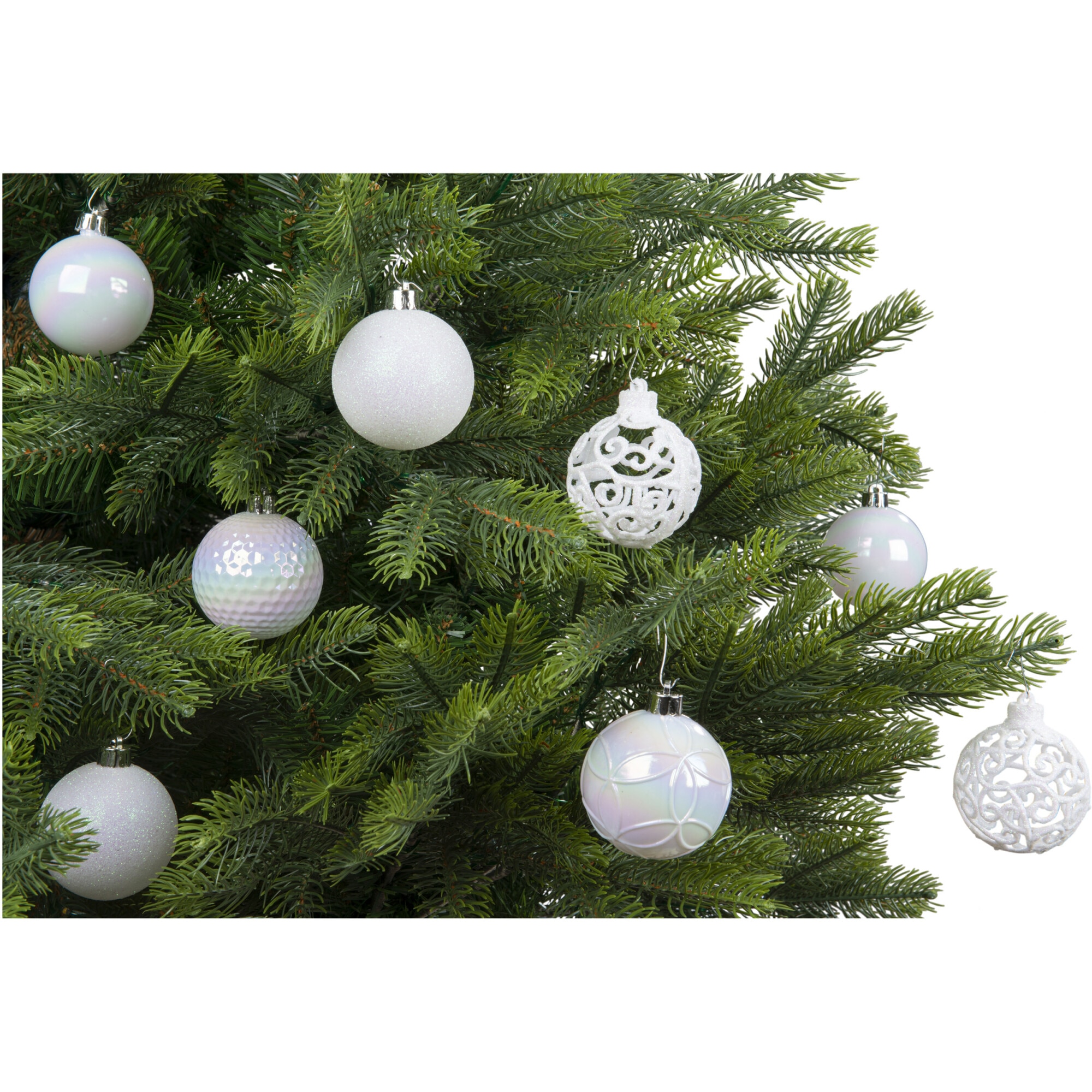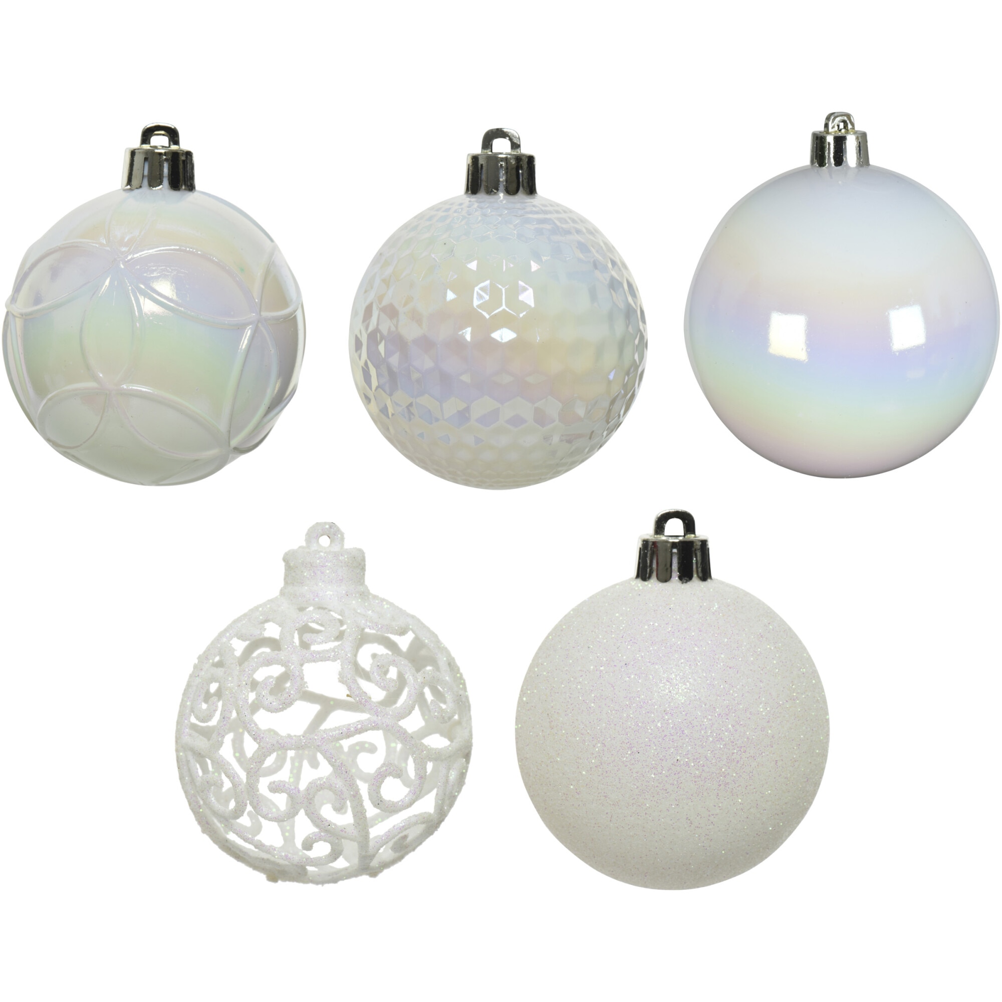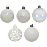 Set 37 globuri Craciun Decoris, diametru glob 6 cm, plastic, finisaje diverse, alb-iridescent
