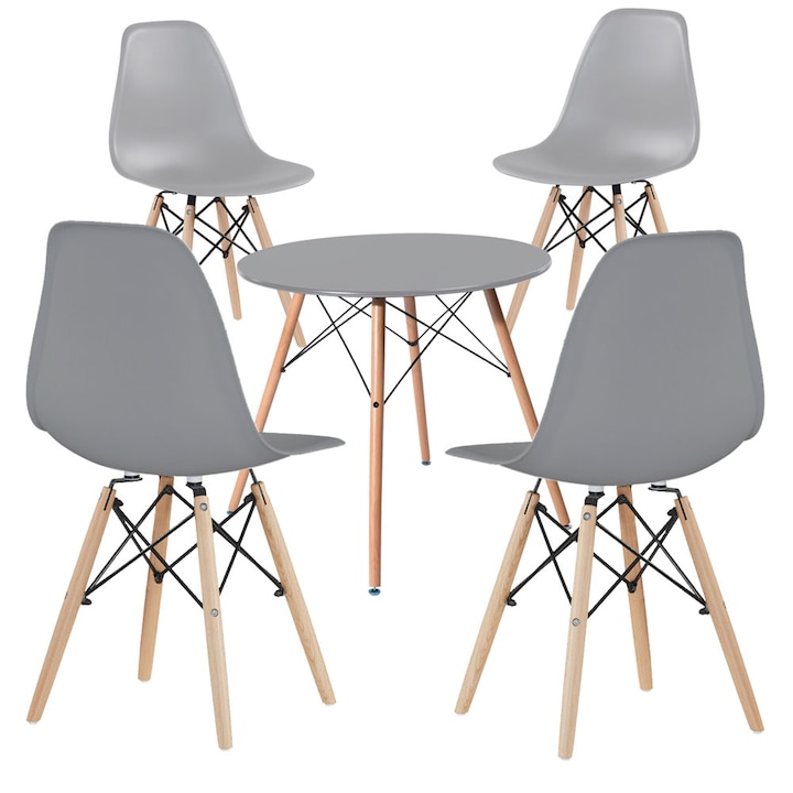Acest set de scaune moderne cu masa poate fi o alegere excelenta pentru acasa si unitati catering. In cursul proiectarii, plasticul, metalul si lemnul au primit rol semnificativ, iar aliajul acestora confera scaunelor un aspect special. Setul de scaune este complet cu masa cu diametrul de 60,5 cm.