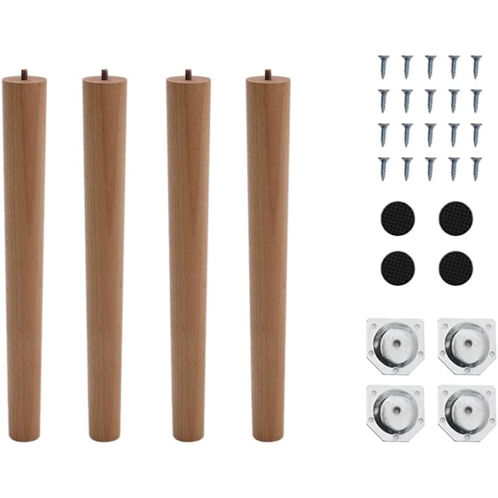 Set 4 picioare mobilier INMOZATA, din lemn masiv, Fag, 39 CM, Crem Natur, accesorii incluse, pentru mese, scaune, dulapuri, noptiera, mobilier TV, canapea