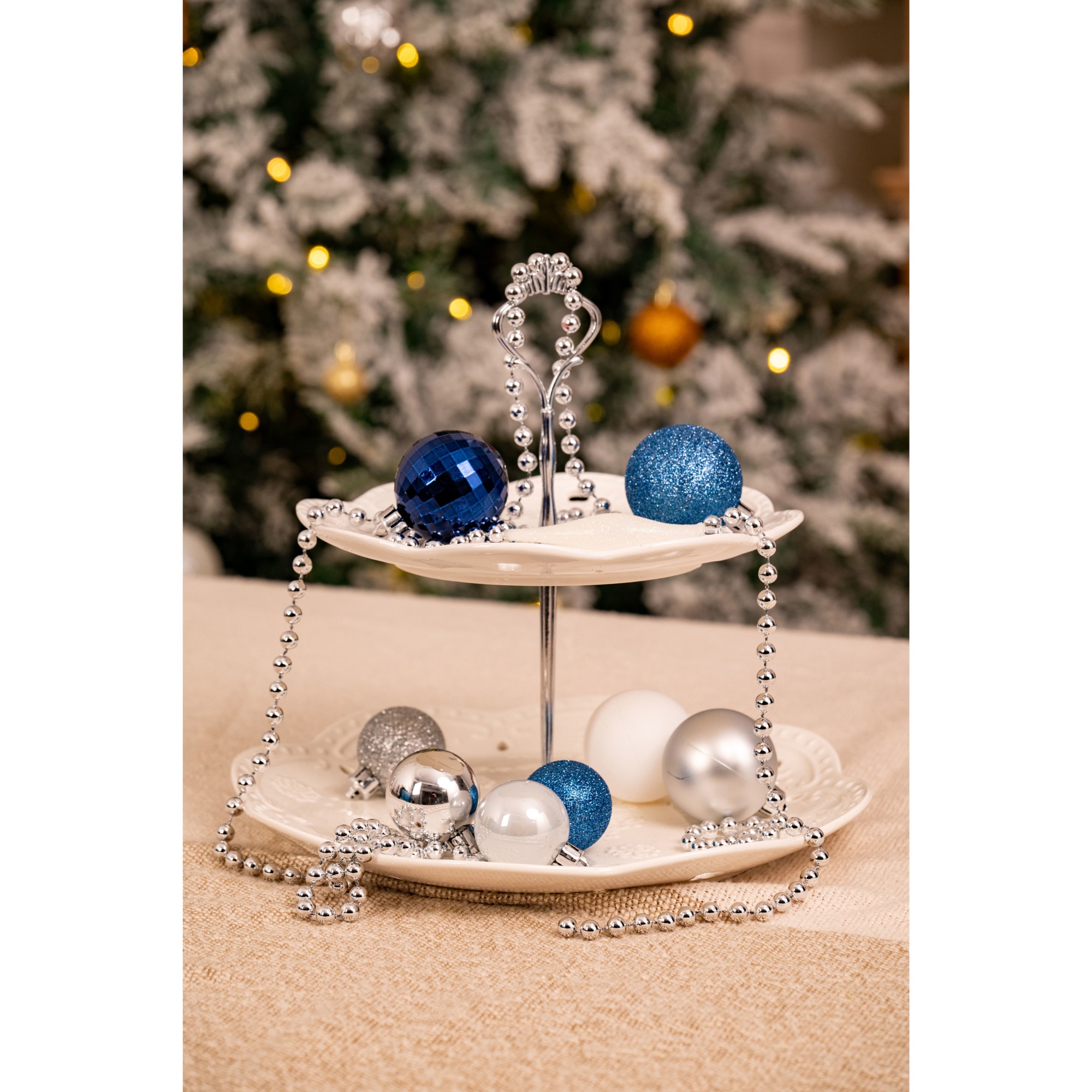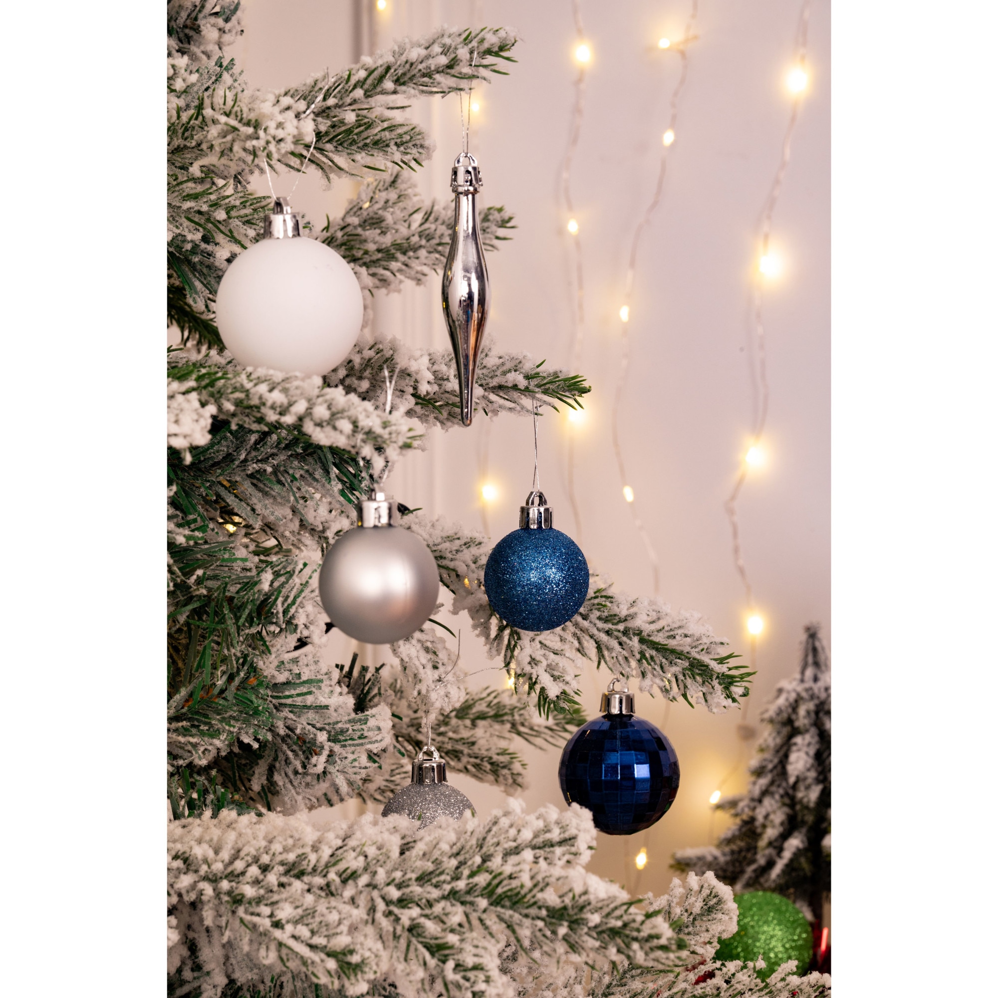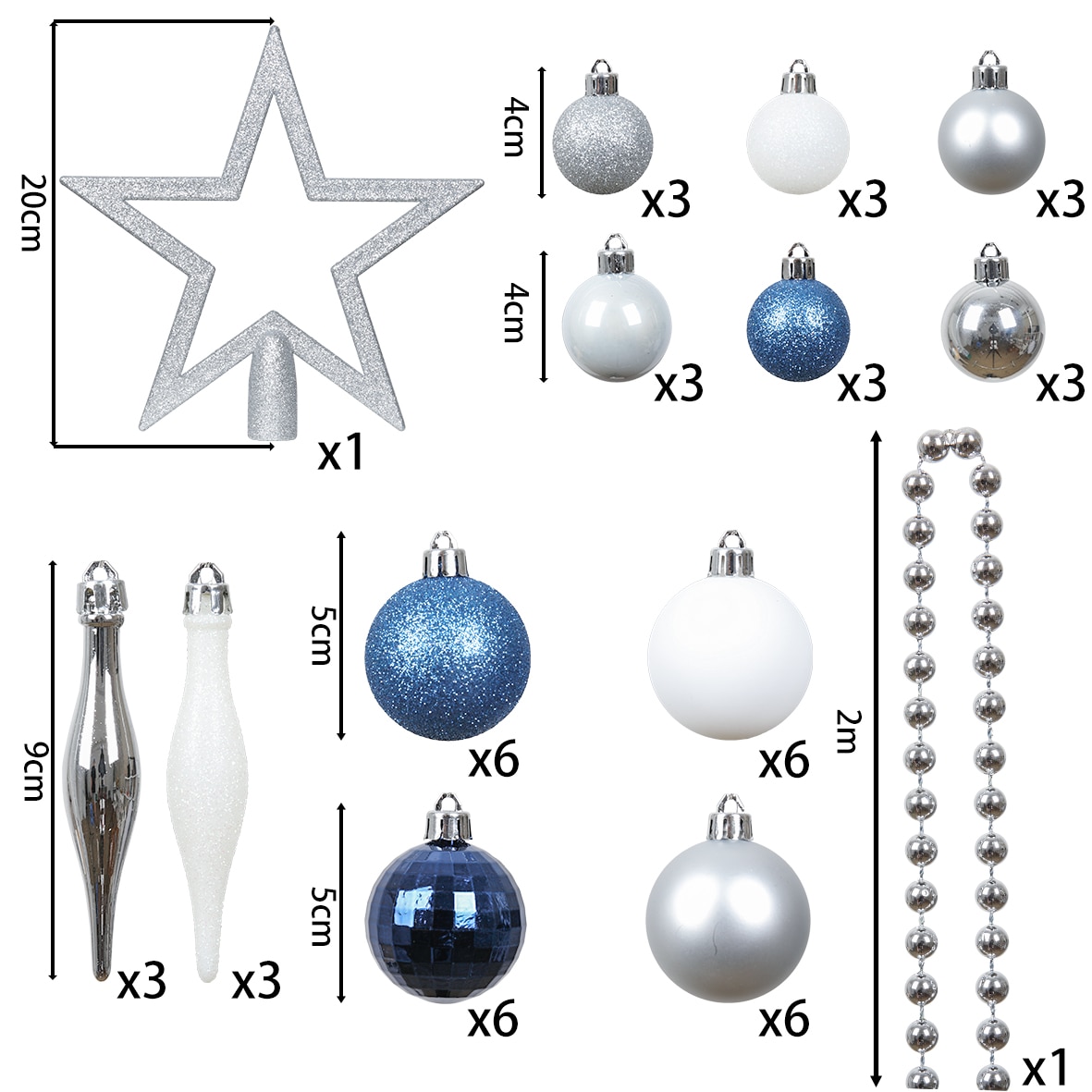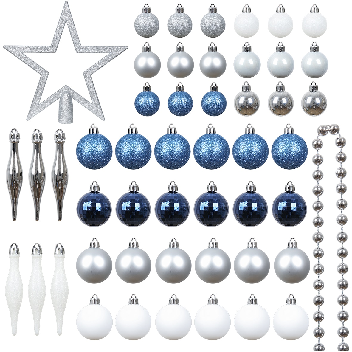 Set 50 de ornamente de brad Kring, globuri, ghirlanda si varf, plastic, Albastru/Argintiu
