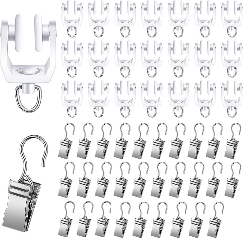 Set 60 carlige pentru scripete pentru perdele, Plastic/Metal, Alb/Argintiu