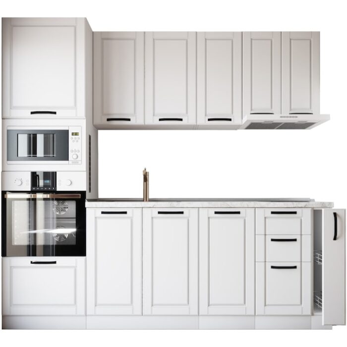 Bucatarie moderna de inalta calitate din MDF VACUUM FOILED, in alb mat, cu usi fara muchii. Manere metalice frumoase, coloana in care puteti incorpora cuptorul si cuptorul cu microunde daca doriti, prin indepartarea doar a usilor pentru aceasta sectiune. Cu fatada alb mat. Cu 3 sertare, multe rafturi, adancime suplimentara in randul de jos de 55 cm si inaltime suplimentara in randul de sus de 72 cm. Vine cu blat inclus in grosime de 38 mm, cu design de tendinta Kronospan Group din 2024. Manere negre acoperite cu pudra, fabricate din metal. Partea din spate alba a dulapurilor. Cu un dulap pentru extragerea hotei pentru un aspect modern.