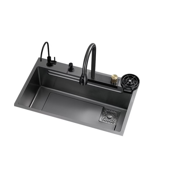 Set chiuveta bucatarie multifunctionala, 4 moduri de spalare statie de lucru, dus extractibil, Spalator pahare, Dozator sapun, Accesorii scurgere incluse, Gri-antracit