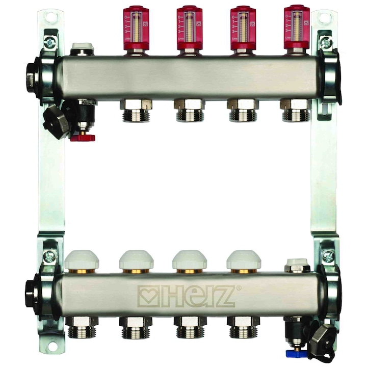 Set distribuitoare inox Herz pentru instalatii de incalzire in pardoseala, plafon sau pereti, cu debitmetre si robinete termostatice – DN25 – 3cai x G3/4″, 1 8632 03