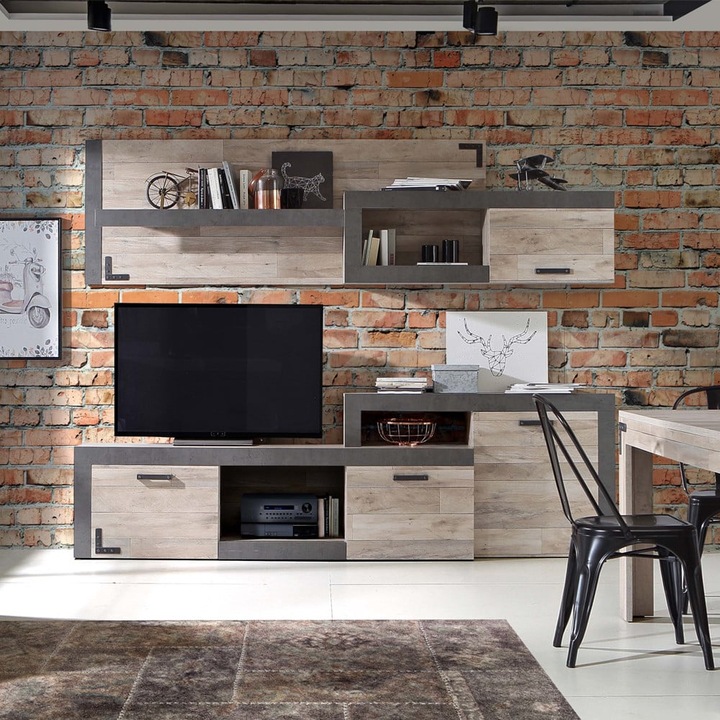 Atunci cand amenajam livingul dorim sa cream un decor intim si confortabil, in care sa ne bucuram de compania familiei si prietenilor. Biblioteca Niagara, realizata din placi aglomerate din lemn cu finisaj stejar vintage si gri inchis beton este alegera perfecta pentru un living modern cu un decor unic.