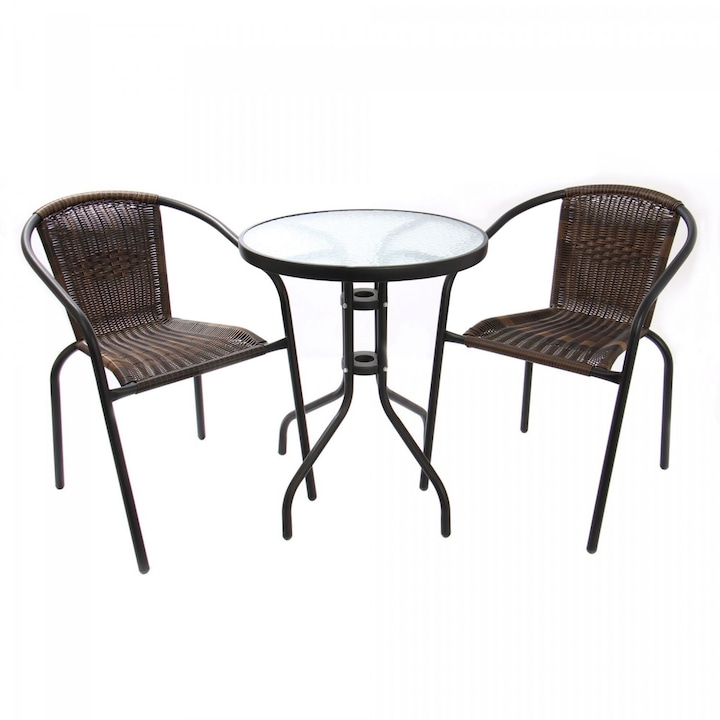 Set masa pentru Gradina IDL® Aruba Brown cu 2 SCAUNE, Realizat din Metal+Ratan sintetic, Suprafata care imita impletitura naturala, Denota eleganta si rafinament si ofera usurinta in asortarea cu celelalte elemente decorative, Culoare-Maro