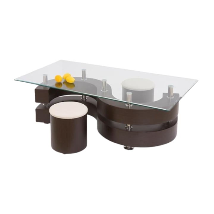Masuta de cafea originala si foarte practica NINA II va satisface chiar si cei mai pretentiosi clienti care cauta solutii la cel mai inalt nivel. Aceasta este o piesa de mobilier eleganta care se va potrivi perfect intr-un interior la fel de stilat, dar si foarte modern. Doua taburete suplimentare fac din aceasta o masa foarte practica si functionala.