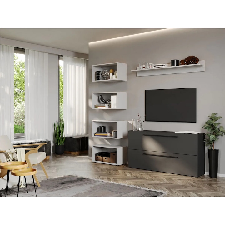 Cele mai recente trenduri in designul de mobilier pentru living sunt reflectate in acest set, de la corpuri suspendate care adauga un plus de aerisire spatiului, la un dulap living generos in spatiu pentru depozitare, completat de o comoda TV eleganta si functionala.
